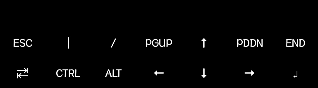 extra-keys = [ \ ['ESC','|','/','PGUP','UP','PDDN','END'], \ ['TAB','CTRL','ALT','LEFT','DOWN','RIGHT','ENTER'] \ ]
